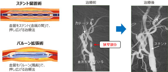 ・ステント留置術 足のつけ根の血管からカテーテルという細い管を頸動脈まで通し、狭くなっている部分に風船(バルーン)を入れて拡げ、金属の網状の筒(ステント)を留置する方法です。全身麻酔の必要はありません。 治療時間は1時間ほどで終了します。入院期間は約2~3日間です。 |