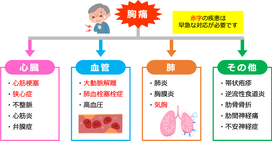 早期に検査を行い胸痛の原因を調べ、不安を取り除き適切な治療を始めましょう。