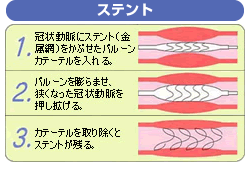 狭心症や心筋梗塞の治療法には、薬による治療やPTCA(経皮的冠動脈形成術またはバルーン(風船)療法ともいいます)、冠動脈バイパス手術(重症の狭心症で、PTCAができない場合に行います。冠動脈の狭くなった部分を避けて血流が迂回できるように、バイパスをする手術です。)があります。薬は胸の痛みを軽くするのには役立ちますが、狭くなっていたり、つまったりしている血管そのものを治すことはできません。