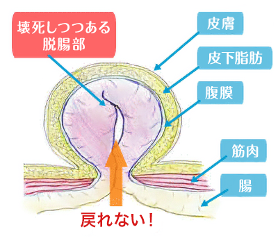 すぐに飛び出た腸を元に戻さないと腸が腐ること(壊死)もあるので、緊急手術が必要です。