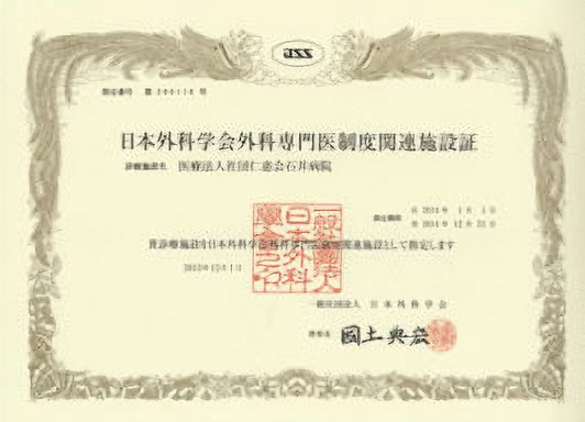 当院は、一般社団法人 日本外科学会の指定により、“定められた指導責任者のもとに充分な指導体制がとられ、かつ、年間50例以上の外科手術症例を有している”等の条件を満たしている施設として「日本外科学会外科専門医制度関連施設」に認定されています。