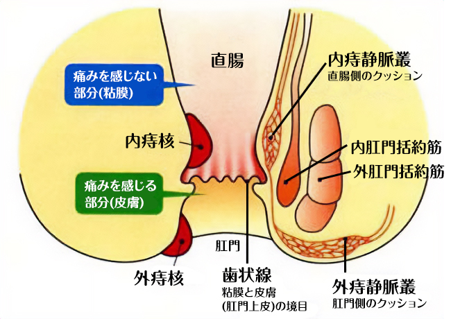 痔核には、直腸側にできる内痔核と、肛門側にできる外痔核があります。