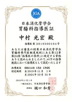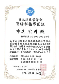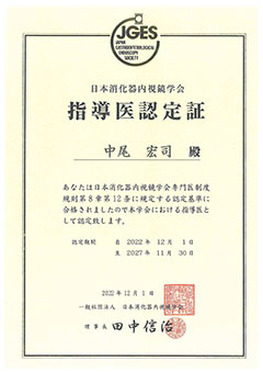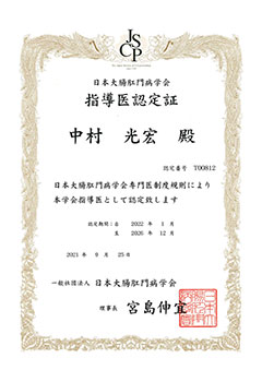 | 【資格等】 | 日本外科学会 外科専門医 日本消化管学会 胃腸科指導医/胃腸科専門医 日本消化器内視鏡学会 消化器内視鏡指導医/消化器内視鏡専門医 日本大腸肛門病学会 大腸肛門病指導医/大腸肛門病専門医 日本消化器外科学会 消化器がん外科治療認定医 日本がん治療認定医療機構 日本がん治療認定医 麻酔科標榜医 |