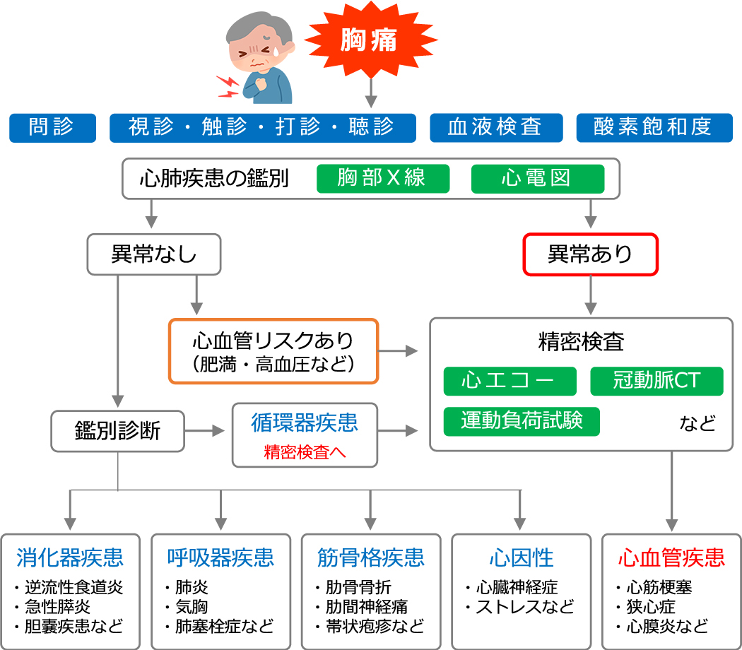 早期に検査を行い胸痛の原因を調べ、不安を取り除き適切な治療を始めましょう。