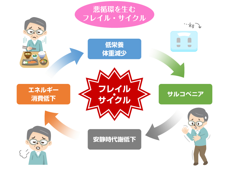 きっかけは「食欲がなくなる」などのささいなことですが、図のような負の連鎖「フレイル・サイクル」に陥ってしまいます。