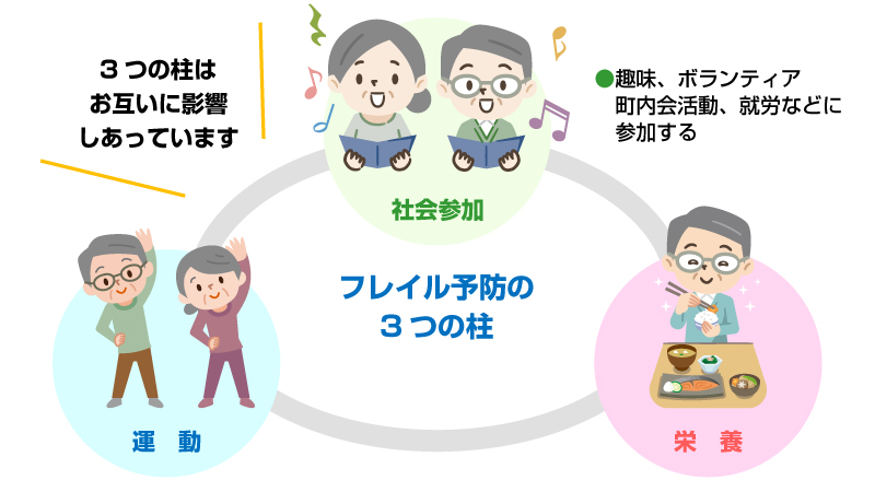 加齢に伴い、体力(筋力)や精神力(認知や社会性)など心身の活力が低下し、多方面から負の連鎖が始まり、寝たきり・要介護の状態に近づくことです。フレイルは、早期に適切な対処をすることで改善される可能性があります。