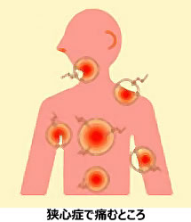 胸痛は30分以上続き、最初の発作で命を落とすことのあるたいへん恐ろしい病気です。狭心症の症状は人によって違っており、痛みを感じるところは胸以外に、みぞおち、背中、左肩、のど、歯などです。