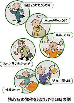 発作を起こしやすいのは、階段をかけ上がったとき、重いものを持ったとき、興奮したとき、冷たい風に当たったとき、飲み過ぎ食べ過ぎたときなどです。睡眠中や朝起きたときに胸痛を起こす安静時狭心症もあります。