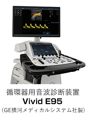 当院ではGE社製ビビッドE95という最新鋭の心エコー専用装置を入れており、画質が鮮明で細かいところまで観察でき、血流の評価や負荷心エコー法についても最先端のことができます。