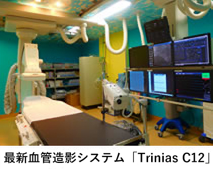 当院では、平成27年5月より、血管造影室に島津製作所製の最新血管造影システム「Trinias C12」を導入しました。心臓や四肢の血管の病気に対して、カテーテルを用いて行う造影検査と治療、透析患者様の内シャント狭窄や閉塞に対するバルーン血管拡張術などに使用する装置です。