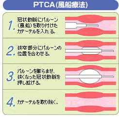 狭心症や心筋梗塞の治療法には、薬による治療やPTCA(経皮的冠動脈形成術またはバルーン(風船)療法ともいいます)、冠動脈バイパス手術(重症の狭心症で、PTCAができない場合に行います。冠動脈の狭くなった部分を避けて血流が迂回できるように、バイパスをする手術です。)があります。薬は胸の痛みを軽くするのには役立ちますが、狭くなっていたり、つまったりしている血管そのものを治すことはできません。