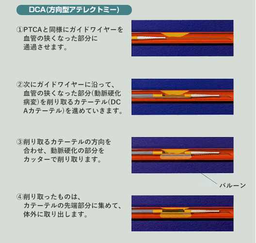 また、狭くなったところをカッターのついたカテーテルで削り取ってしまうアテレクトミー(DCA)という治療法もあります。手術に比べて短時間で終了し、数日の入院期間で済みます。退院後も内服治療が続きますので、定期的な通院を続けてください。もしまた胸が痛くなれば、受診日でなくとも早急に病院まで連絡してください。