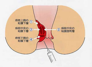 これは痔核に薬液を十分に浸透させるための方法で、四段階注射法といいます。